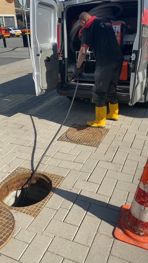 Doorspuiten regenwaterafvoerleiding met hogedrukreiniger